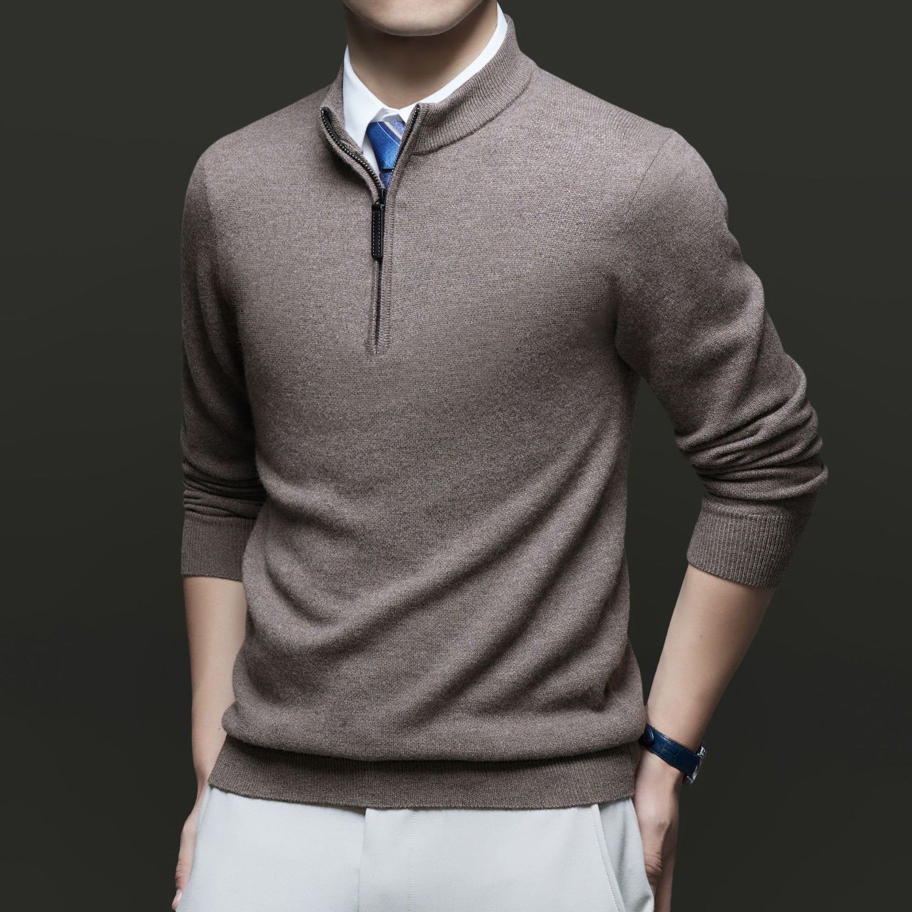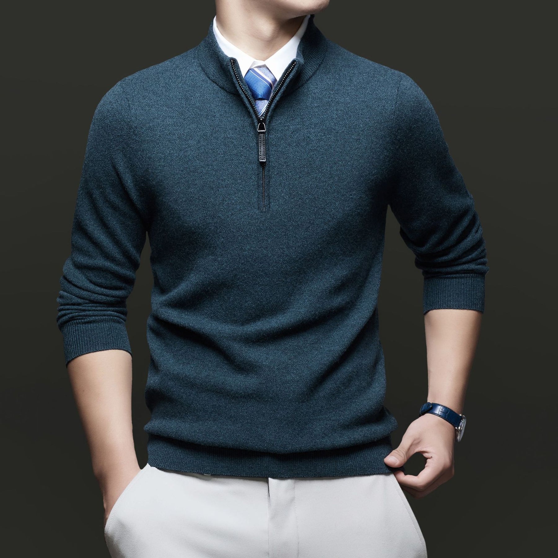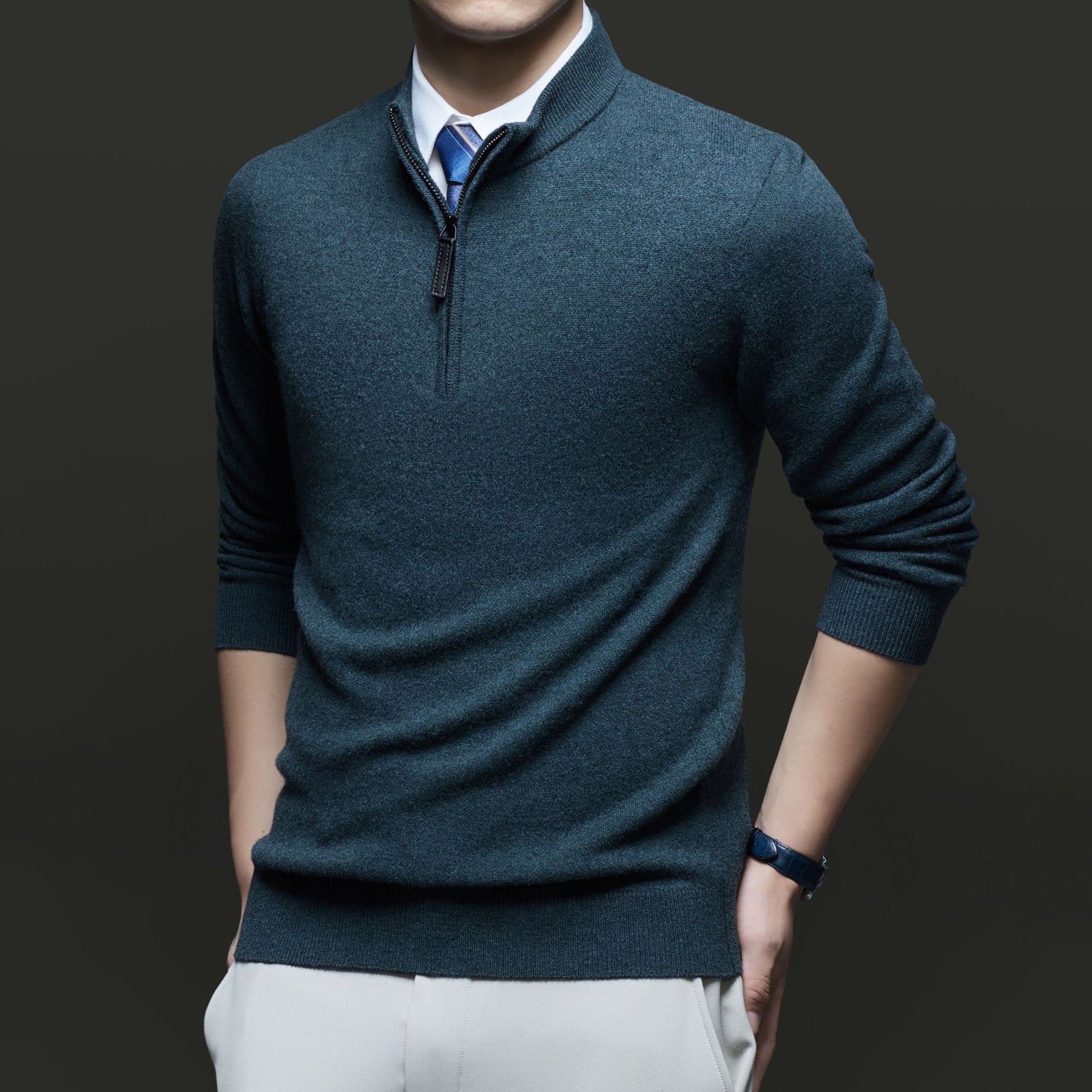Entdecken Sie unseren Herren Pullover mit modernem Stehkragen und hochwertigem Reißverschluss von WW. Dieser Pullover kombiniert Stil und Komfort und ist ideal für geschäftliche und lässige Anlässe.