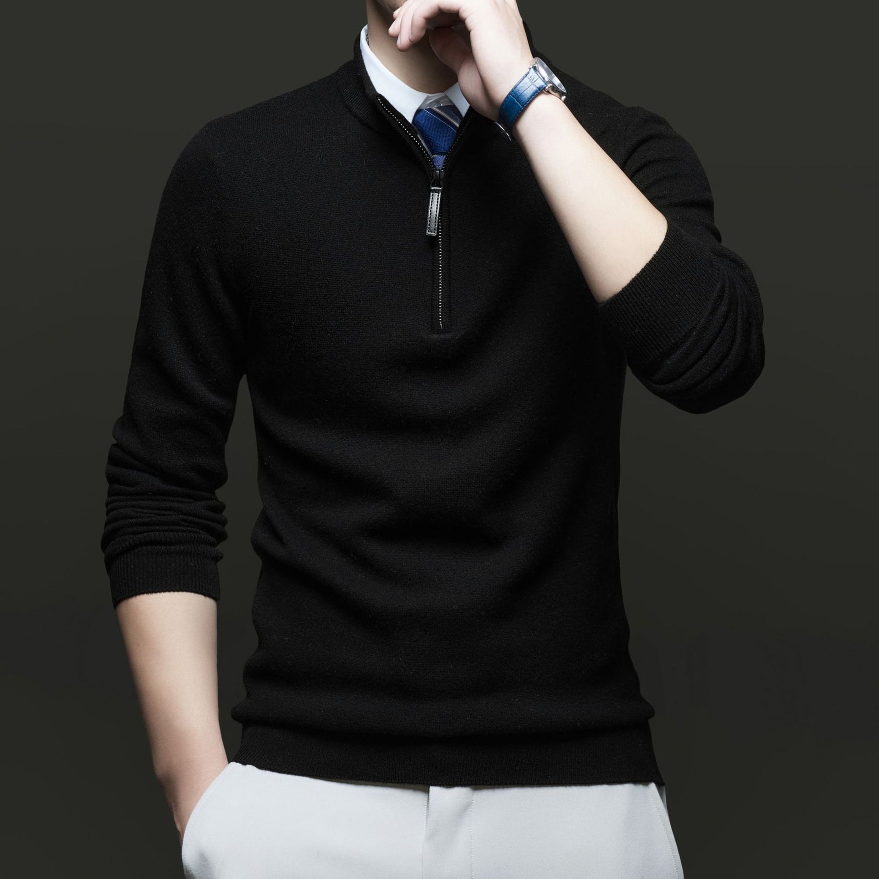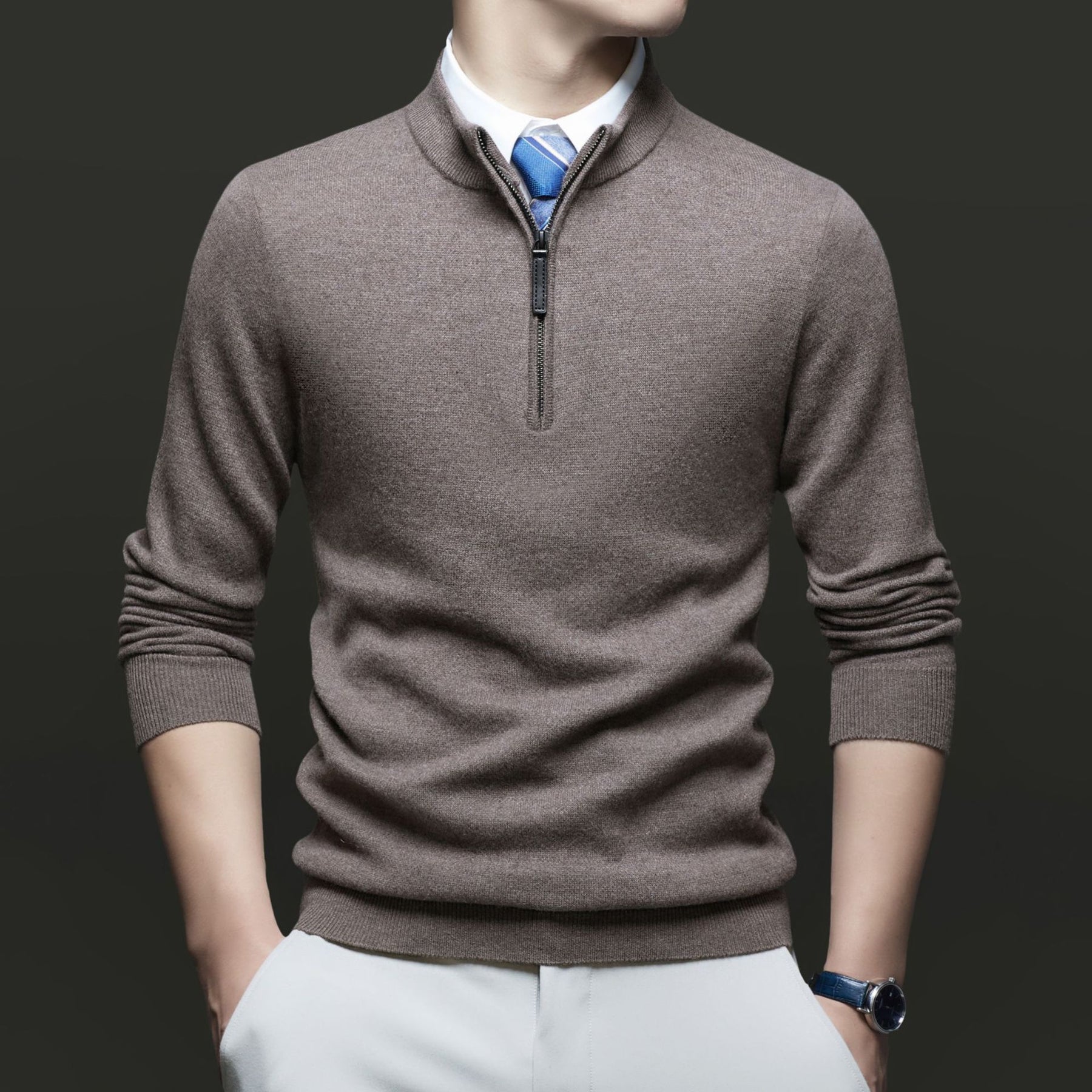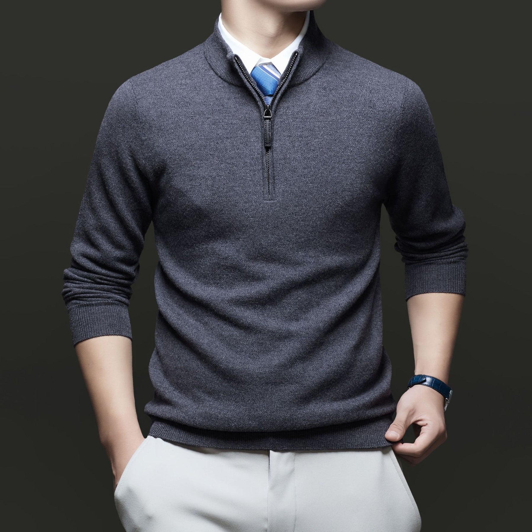 Entdecken Sie unseren Herren Pullover mit modernem Stehkragen und hochwertigem Reißverschluss von WW. Dieser Pullover kombiniert Stil und Komfort und ist ideal für geschäftliche und lässige Anlässe.